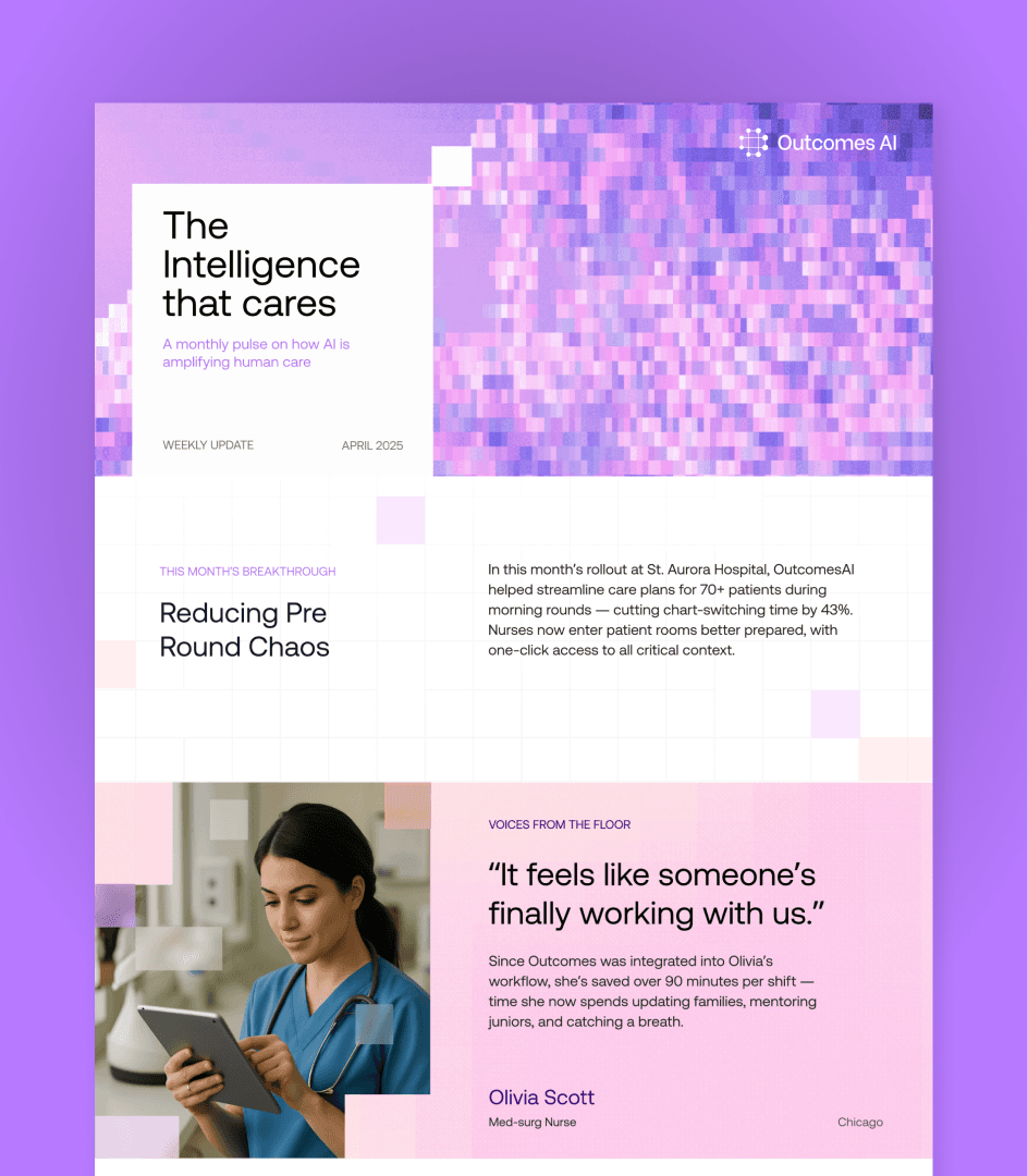 OutcomesAI is a nurse-first AI platform that works quietly to reduce administrative load and bring focus back to patient care.