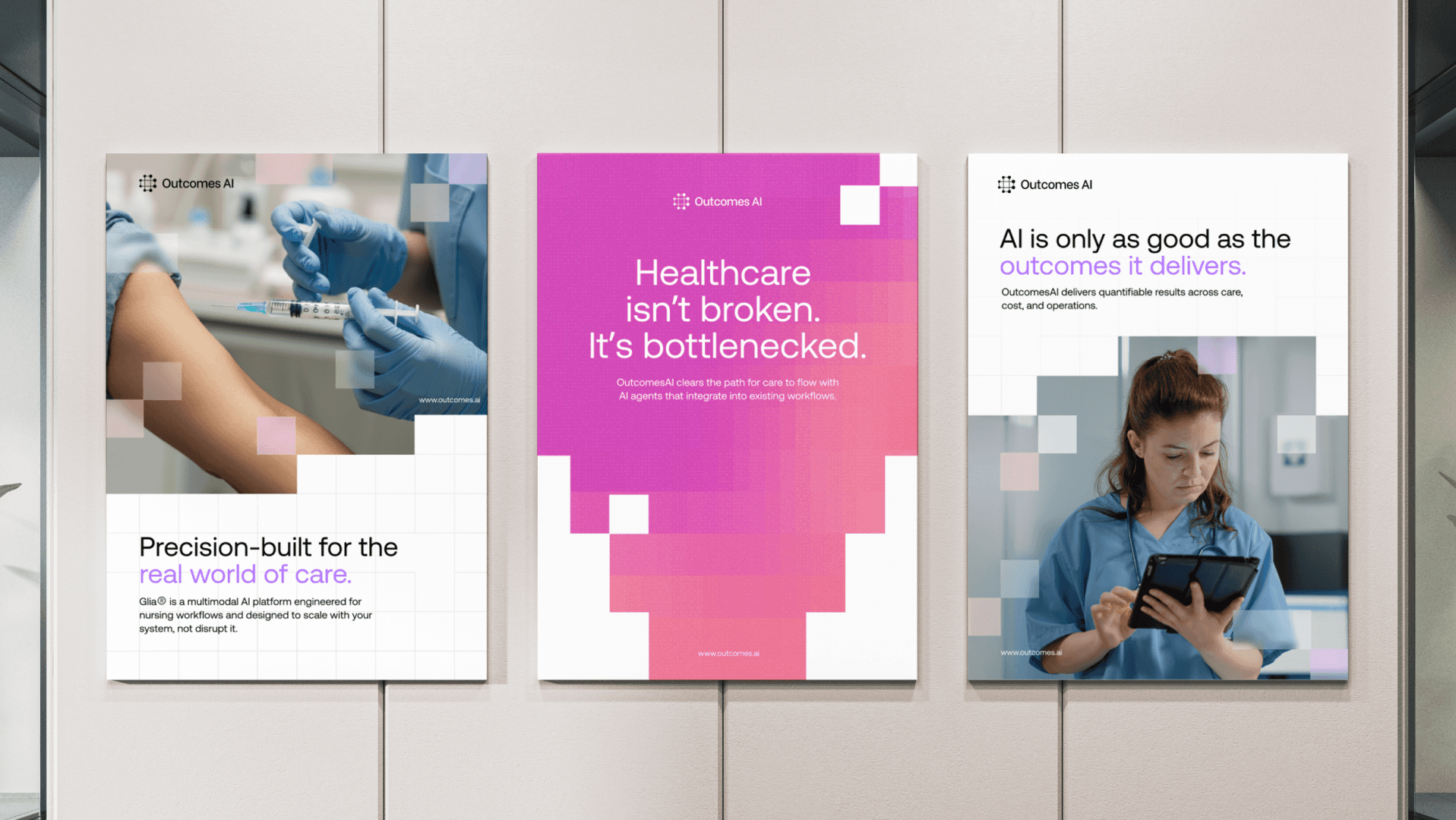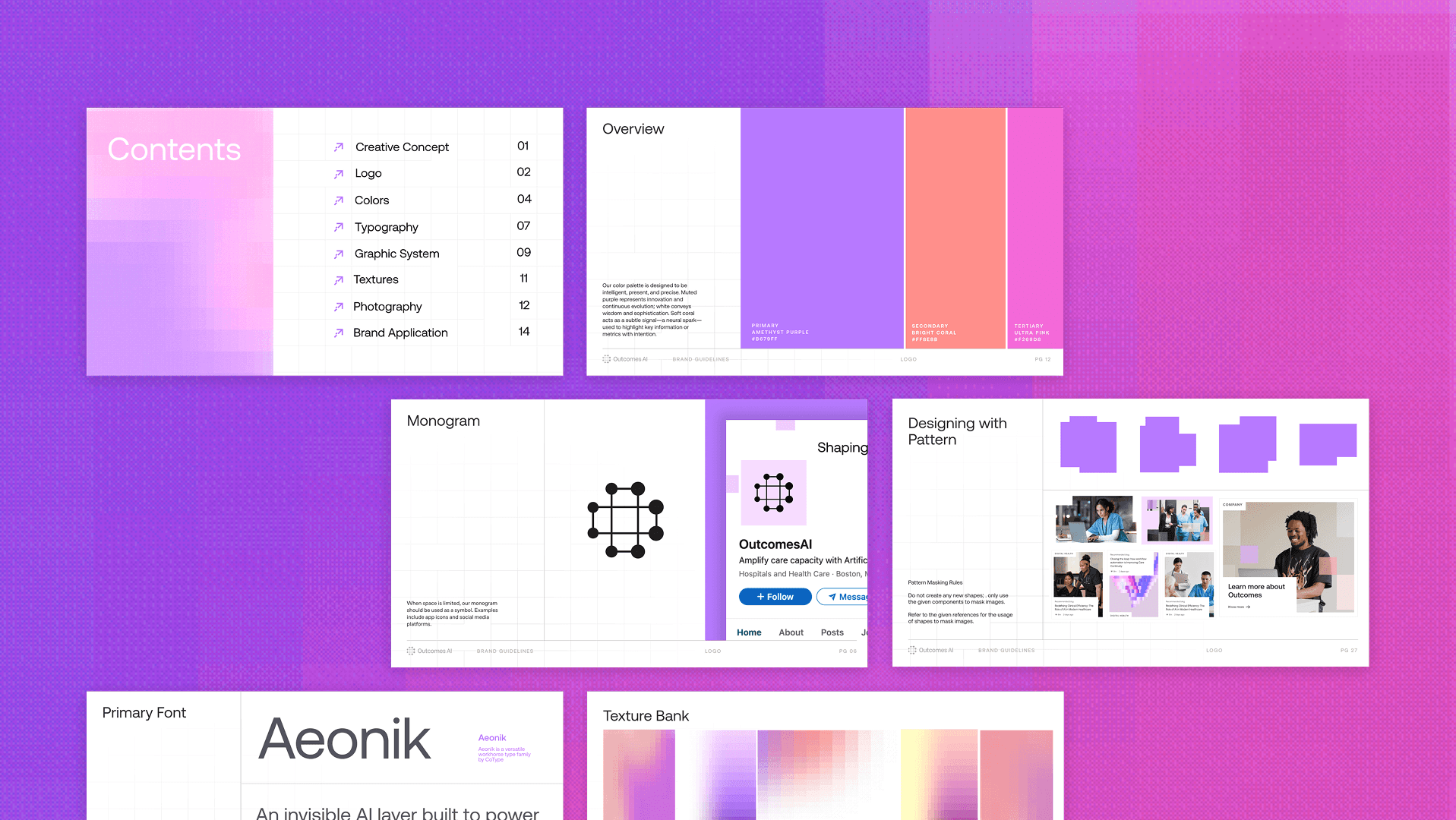 The identity is built around the idea of an invisible layer of support. OutcomesAI does complex work in the background, so the brand had to feel calm, reassuring, and unobtrusive.