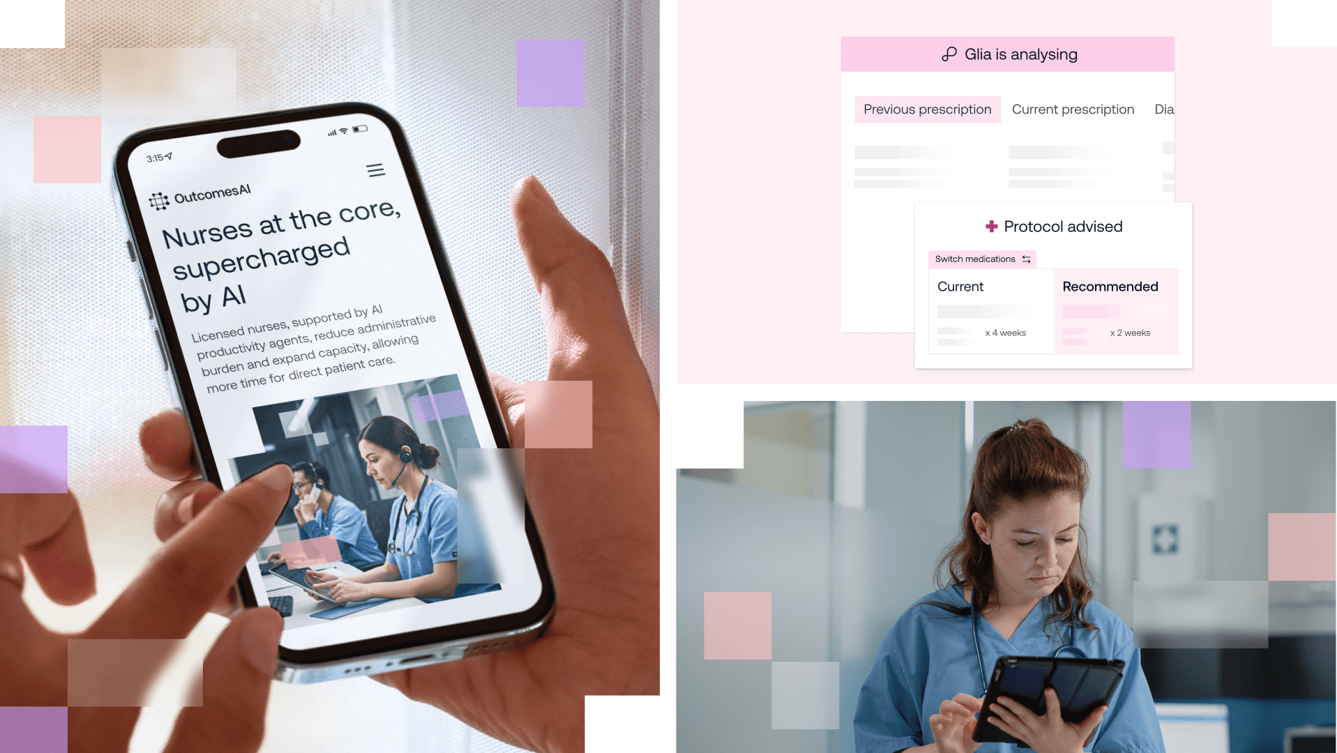 The pattern gives form to the invisible layer of support behind OutcomesAI. Built from soft, pixelated squares and rectangles, it represents the unseen intelligence working quietly within clinical workflows.